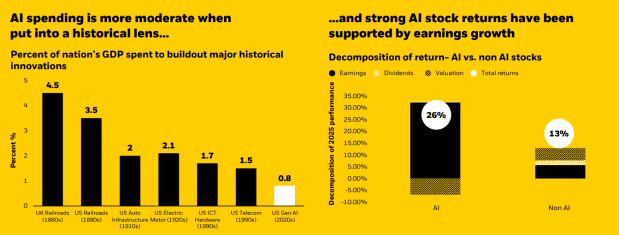 The spending looks big (about 0.8% of US GDP), but historically? It’s actually modest. The railroad boom of the 1860s consumed 4.5% of GDP. US auto infrastructure in the 1910s? 2%. AI is just warming up.