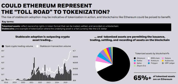 Stablecoin transaction volumes are outpacing crypto trading. About 65% of tokenized assets run on Ethereum. We’re not talking about speculative crypto gambling anymore. We’re talking about putting real assets, private credit, even real estate on blockchains.