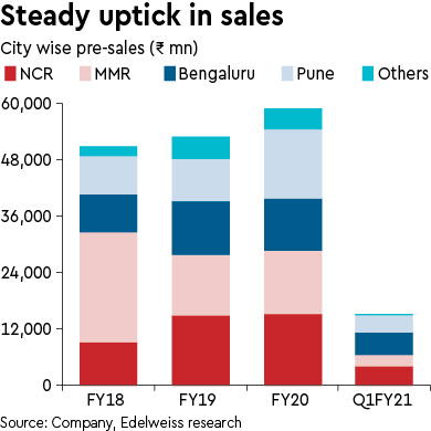 Healthy sales performance despite muted launches: GPL’s new sales in Q1FY21 were aided by: (i) digital tools; (ii) NRIs, who accounted for ~50% of bookings; and (iii) the 10:90 payment plan. Work has resumed on almost all sites post-lockdown.