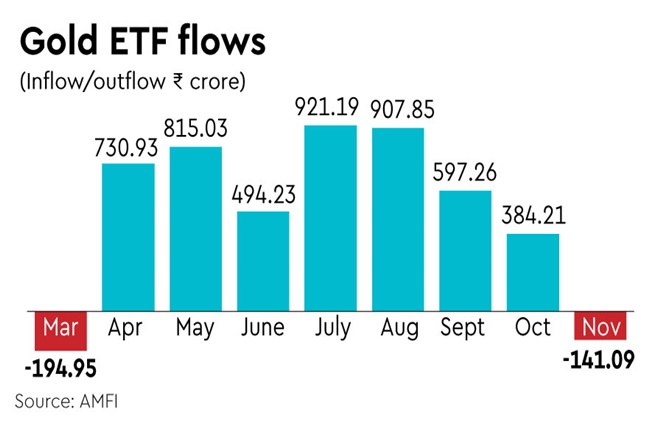 For the first time since March, gold exchange traded funds (ETFs) have witnessed outflows. The sharp rise in the equity markets in November has taken some of the sheen away from gold ETFs. The latest Amfi data showed that the gold ETF category saw an outflow of Rs 141.09 crore in the last month.