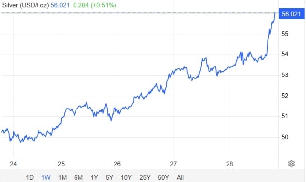 Silver currently trades at its all-time high price of around $55.55, up over 15% in the last month and a staggering 92% so far this year.