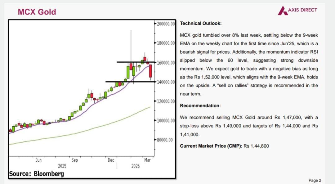 Axis Securities in its commodity insights report recommended selling MCX Gold at Rs 1,47,000. The brokerage said that the safe-haven demand for gold fell over the escalations in the Middle East conflict, along with high dollar, and profit-taking by investors as they liquidated their positions to offset losses.