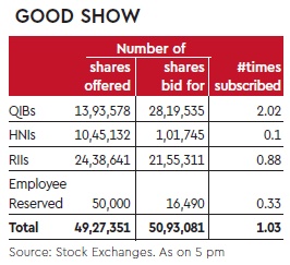 The initial public offering (IPO) of Amber Enterprises, a manufacturer of air conditioners and components, was fully subscribed on the first day of its bidding on Wednesday. Investors bid for 50.93 lakh shares against 49.27 lakh shares reserved for them, bidding 1.03 times, while qualified institutional investors subscribed 2.02 times of the shares offered to them. High Net Worth Individuals, retail investors, and employees subscribed 0.1, 0.88 and 0.33 times respectively of the shares allotted to them. Amber Enterprises had raised Rs 179 crore from anchor investors on Tuesday. The company has priced its IPO in the range of Rs 855–859. When calculated at the upper end of the price band, this will put the offer size at Rs 600 crore. The three-day issue will close on January 19. The offer is expected to help the company repay a portion of its borrowings and for the promoters to realise some value through dilution of a 10% stake.
