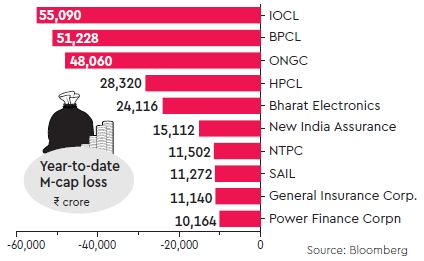 Among the PSUs, Indian Oil Corporation (IOCL) witnessed the largest erosion in market capitalisation so far this year. While the market value of IOCL declined by Rs 55,090 crore since January, BPCL and ONGC saw their market cap eroding by Rs 51,228 crore and Rs 48,060 crore, respectively.