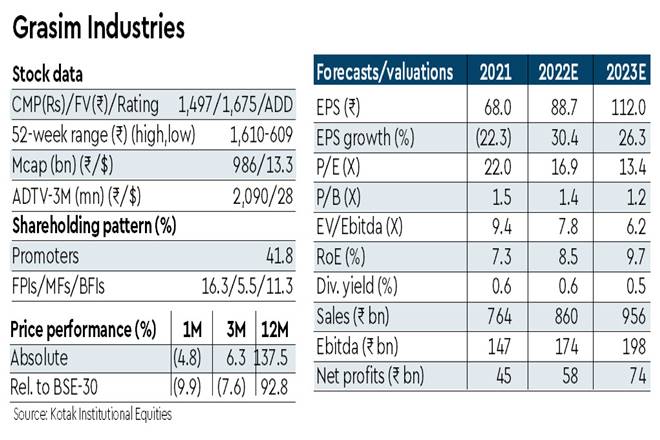 Grasim’s Q1FY22 EBITDA came in line with our estimate with higher VSF prices offsetting lower volumes. VSF business continues to benefit from strong demand led higher prices whereas chemical margins have started recovering from record lows. Grasim’s VSF and chemical division would see ~30% capacity expansion over the next 6-12 months, which would drive volume growth. Standalone business is well poised to become net debt free by FY2022e with divestment of the fertiliser business. We increase our Fair Value to Rs 1,675 (from Rs 1,520) on roll over. Maintain Add.
