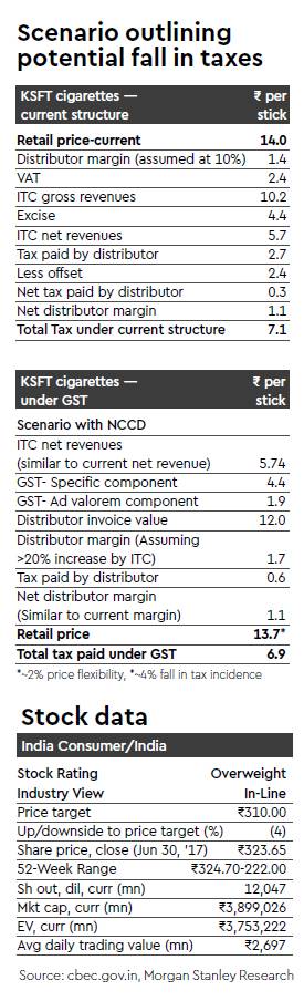 In the scenario that NCCD is levied at the existing rate, our calculations suggest ~4% reduction in cigarette taxes and ~2% price flexibility for ITC . However, in the event that NCCD is not applicable on cigarettes, we see a higher 7% reduction in cigarette taxes and ~3.5% price flexibility. We note that under GST, tax incidence on the supply chain will rise, which would mean that ITC will increase distributor margin by ~2 ppt (built into our estimates of price flexibility for ITC).