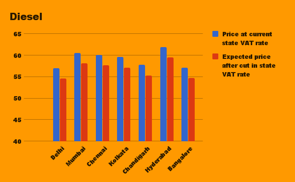 In other major cities, the price of diesel after retail VAT rate cut will also down by Rs 2.4-2.5 per litre. In Chennai, the diesel price will go down from Rs 60.10 per litre to Rs 57.70 per litre, in Kolkata from Rs 59.66 to Rs 57.14, in Chandigarh from Rs 57.81 to Rs 55.33, in Hyderabad from Rs 61.93 to Rs 59.49, in Bangalore from Rs 57.11 to Rs 54.71.