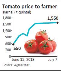 According to Agmarknet data, tomato prices started rising from June 20 onwards and it has now trebled to Rs 15.50 per kg from about Rs 5 per kg on June 15 in Karnal mandi. The retail price of tomato in Delhi market has also increased to Rs 46 a kg on June 25 from Rs 27 a kg on June 15, according to consumer affairs ministry data. “There is hardly any tomato left for harvesting. We would have waited had there been any technology to keep it for a longer time,” said Sohanpal Singh, a tomato farmer in Sonepat district.
