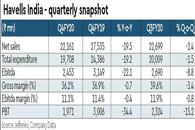 Revenue: Q4FY20 segmental sales split was as follows: (i) Switchgears Rs 3.5 bn (-14% y-o-y); (ii) Cables Rs 6.8 bn (-24% y-o-y); (iii) Lighting Rs 2.6 bn (-23% y-o-y); (iv) ECD Rs 4.6 bn (-14%); and (v) Lloyd at Rs 4.6 bn (-14% y-o-y).