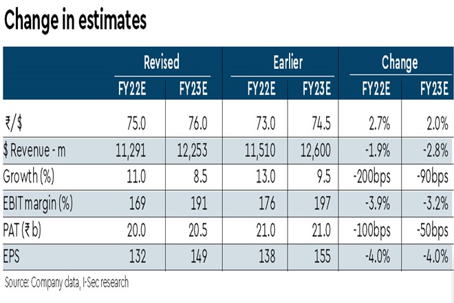 Guidance signals weaker confidence: Both revenue and margin guidance are unusually abstract and underwhelming. While the company reported strong deal wins (TCV of $3.1 bn), the street is unlikely to take much comfort given the limited causality on growth in subsequent periods. Notwithstanding INR depreciation benefit, we cut our TP by 8% implying a lower target multiple of 19x FY23e EPS.