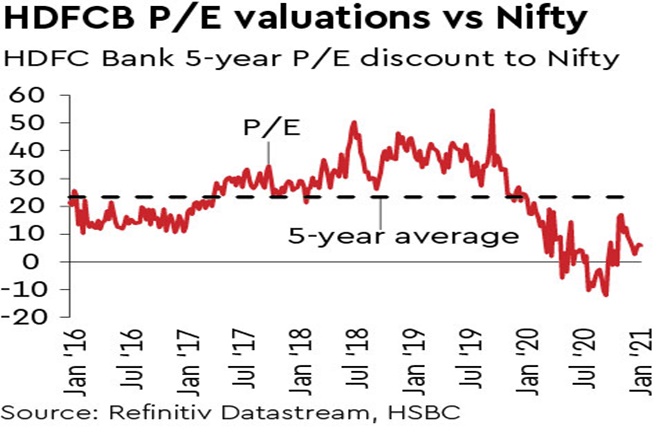 Buy – Accelerated market share gain with controlled quality and costs: Our FY21-23 estimates are revised marginally on back of lower credit costs assumptions. HDFCB is advantaged by its investment in distribution, lower cost of operations and funds, and clean underwriting track record. With falling RWA intensity along with improving operating profitability, HDFCB is a leader by some distance among its peers on RoE. Our TP of Rs 1,680 (vs Rs 1,660 earlier) implies 22x 1-yr fwd EPS for forecast average FY22-23e RoE of 18%. On a P/E basis, HDFCB is still trading below its historical premium/ discount to NIFTY valuations.