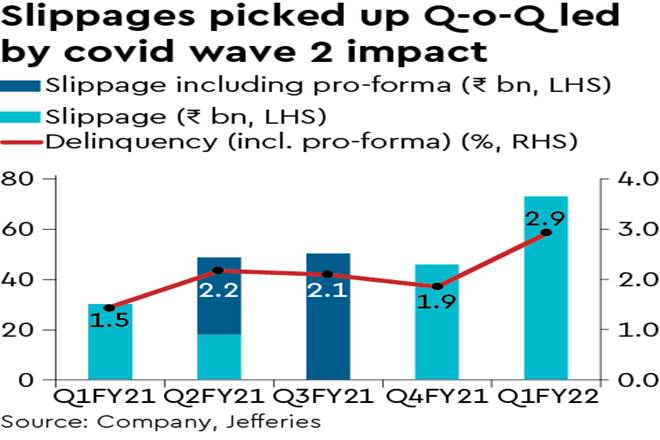 For Q1FY22, HDFCB’s profit of Rs 77 bn was up 16% y-o-y, a tad below estimate largely due to higher credit cost on NPLs & contingent provision of Rs 6 bn. As expected, slippages were higher at 2.9% of past year loans (annualised), but we expect it to moderate from Q2. Key positive was in management commentary that both lending & collection trends for July seem close to normal/pre-Covid levels and will reflect in performance from Q2. No update on RBI/card issue. Buy stays.