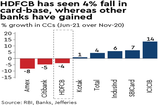 Release of restrictions on new credit cards to help rebuild pipeline: HDFC Bank clarified that RBI has allowed it to resume issuing new credit cards, lifting the restriction that was imposed in Dec-20, following RBI’s review of the bank’s digital/IT systems for outages in recent years. This is positive for the bank as it has not been able to acquire new customers for the past 8 months, and while this has had limited near-term impact on earnings, lack of new credit card clients has a tail-impact on revenue potential. Since Nov-20, HDFCB’s credit card customer base is down 4%, while others have grown between 6% and 14%. HDFCB’s share in number of cards and value of transactions has declined by 200-300bps.