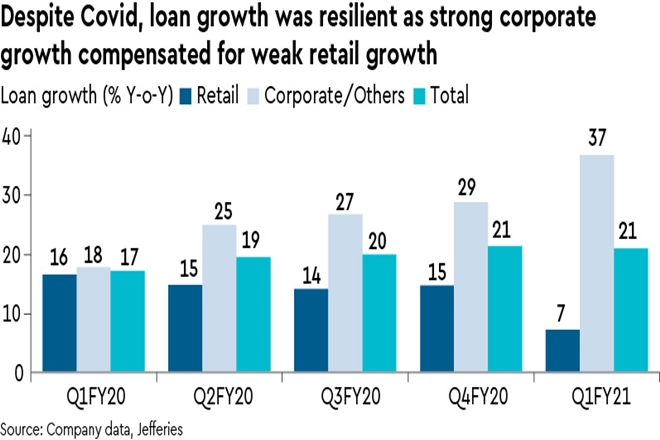 Pushing growth in corporate with high quality: Bank delivered 38% growth in corporate loans as it leveraged on deposit franchise and refinancing of capex and working capital loans. It maintained the high-rating profile of corporate loans with 86% of loans rated AA and above. Not only has it leveraged deposit franchise to gain market share here (deposits up 25% and Casa up 26% to 40% of total), it also leveraged corporate relationships for direct and salary deposit accounts. As highlighted earlier, banks with strong deposit franchise should see healthy growth in FY21-22 as they gain share from bonds and NBFCs.