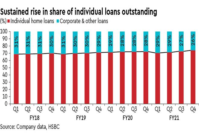 HDFC delivered a solid 60% y-o-y increase in individual home loan disbursements in Q4 (42% y-o-y growth during H2FY21), which resulted in a healthy 5% q-o-q and 13% y-o-y increase in individual loans (net of assignments). Overall loan growth (+11% y-o-y /+3% q-o-q), however, was impacted by heavy run-down in the lease rental discounting book during the quarter. Management indicated that loan disbursements in April alone are higher than that recorded during Q1FY21. However, the momentum is likely to cool off in coming months due to rising COVID-19 caseload and intermittent lockdown situation.