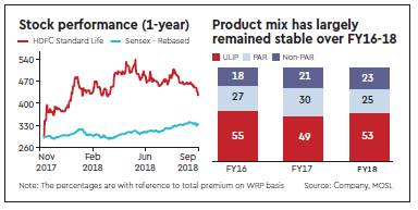 Increase in total expense due to incremental commission rates, expanding distribution reach and investment in technology: First year and single premium commission has increased by 70bp y-o-y each to 18.4% and 0.8% in FY18. This has resulted in 30% y-o-y growth (v/s 11% y-o-y in FY17) in first year premiums and a 33% y-o-y growth in single premiums. HDFC Life continued to widen its presence and distribution touch-points, through several new tie-ups and partnerships comprising 163 (as of Q1FY19) bancassurance partners and 26 partnerships (as of Q1FY19) within the non-traditional ecosystem.
