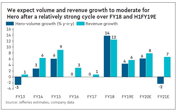 We expect Hero’s margin to remain under pressure over FY19-21e given high competitive intensity and cost pressures. We estimate Ebitda margin to be in 13-15% range over FY19-21e vs. 15-17% over FY16-18. We cut revenue estimates by