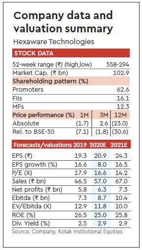 $100 mn+ deal won in Q4CY18. The cancellation of this contract could have potentially impacted CY2020e growth; however, Hexaware believes that strong deal pipeline and closures can help offset this impact. Hexaware reported that excluding transaction costs the acquisition will be EPS neutral on a GAAP basis. We incorporate the Mobiquity acquisition in our estimates. This results in a 9% increase in revenue estimates for CY2020 and CY2021. Revenue increase in CY2019 is lower due to the fact that acquisition revenue will flow in only for part of the year. Mobiquity’s Ebitda margin is ~14%, similar to Hexaware’s Ebitda margin. We bake in annual amortisation cost of Rs 574 mn resulting from the acquisition. Our EPS estimates are largely unchanged.
