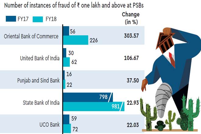 SBI’s associates were merged with it at the beginning of FY18. Following SBI was Gurugram-based Oriental Bank of Commerce (OBC), a lender with a loan book size just over 7% of SBI’s. The year-on-year (y-o-y) rise in instances of large-value fraud at OBC was the highest among all PSBs — the count for FY18 was 226, up 303% from 56 in FY17. Among banks which saw a substantial y-o-y drop in fraud cases was Bengaluru-based Vijaya Bank, where the number of large-value frauds declined 67% y-o-y to 19 in FY18.