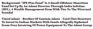 In one complex structure, a Vinod Adani controlled company had invested in “Global Dynamic Opportunities Fund” (“GDOF”) in Bermuda, a British overseas territory and tax haven, which then invested in IPE Plus Fund 1, a fund registered in Mauritius, another tax haven, said Hindenburg citing documents recieved through a whistleblower.