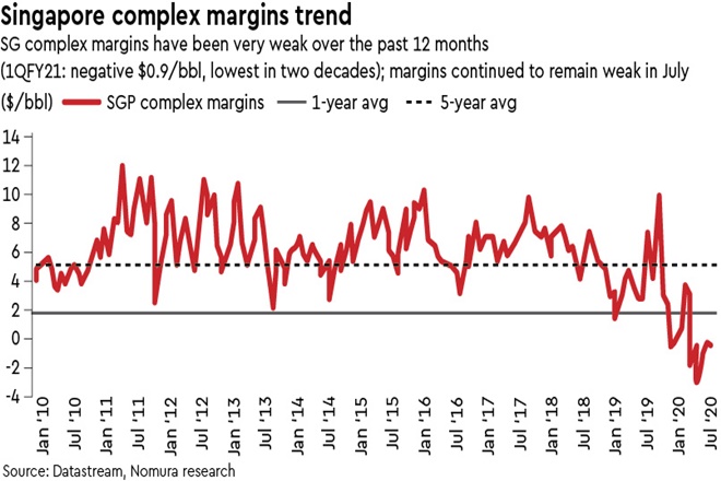 Refining margin very weak; Middle East discounts diminish; volume outlook weak: SG complex margins remain very weak (-0.3$/bbl in July), and the near-term outlook remains subdued. Unlike Q1, OMCs will not benefit from large crude discounts offered by Middle East countries. Continued lockdowns in several states diminish near-term demand recovery and HPCL expects recovery to pre-COVID levels to take a few more months.