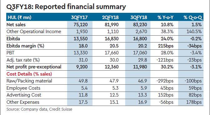 HUL’s Q3FY18 earnings grew 30% y-o-y, marginally ahead of our estimates, while volumes grew 11%, higher than expectations. Volume growth of 11% came on a very weak base of 4% decline in Q3FY17 which was impacted by demonetisation. However, this marks an improvement in trend as the two-year volume CAGR moved to 3.2% this quarter compared to 1.5-2% in the last few quarters. We expect this trend to sustain going ahead as GST rate cut has driven price cuts and grammage increases kick in. Ebitda grew 24% y-o-y driven by gross margins. This was despite ad spends sharply increasing by 25% y-o-y, which implies HUL continues to invest in innovations to drive future growth. Management soundeds confident on continuing the aggressive cost reduction programme which saved 6% of sales as costs in 2017. This is critical, given the rising input cost pressures due to crude. Maintain Outperform on HUL, target price increases to Rs 1,530 (from Rs 1,500) on roll forward. We expect the GST driven price cuts to stimulate volume growth and also provide a buffer to mitigate input cost inflation.