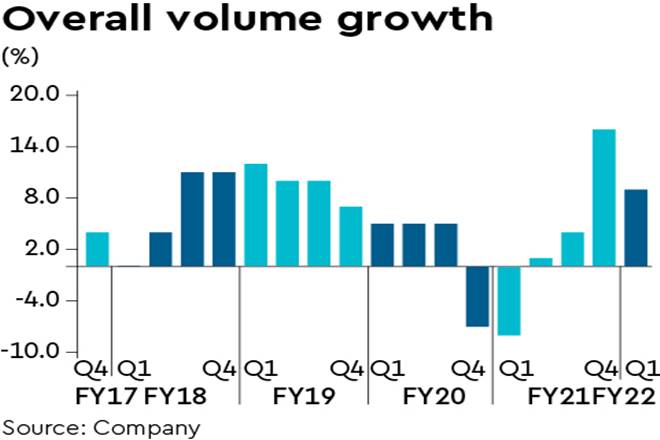 Conference call takeaways: Q1FY22 pricing is ahead of Q4FY21. The sequential lower difference in value and volume is down to Covid-led promotions volatility. With commodity prices at multi-year high levels, the company is looking to make sensible pricing decisions to maintain its healthy volume growth. As mobility improves, the mix would improve; hence margins too will improve.