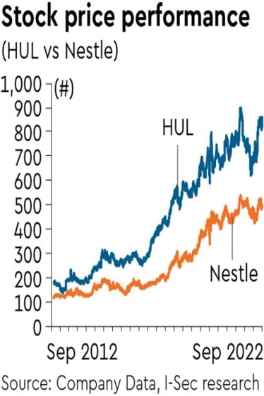 We believe Nestle may potentially outperform HUL in long term driven by multiple favourable factors (both extrinsic and intrinsic). In Nestle, we like penetration-led volume growth on the back of rural expansion among peers. There is lower threat from D2C (direct-to-consumer) brands given the inherent challenges in scaling up in Foods category. There is opportunity to bring more from global portfolio in true long term.