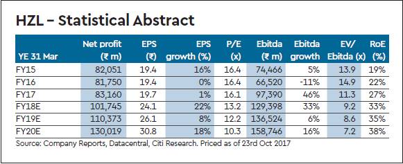 At Rs 30.2 billion (in-line) Hindustan Zinc’s (HZL’s) 2Q Ebitda rose 46% y-o-y on higher volumes and LME prices; offset in part by higher costs. Volumes were in-line — mined metal production increased 14% y-o-y but declined 6% q-o-q on lower ore treatment (to be recovered in the next quarters). Refined metal production growth was higher at 27% y-o-y (HZL utilised 60kt of concentrate stock in 1H). HZL expects mined metal production to be higher y-o-y, refined production to rise ~17% in FY18. CoP expected to ease — Zinc CoP ex royalty was stable q-o-q at $984/t. Management expects CoP to decline in 2H – HZL should receive linkage coal from Coal India (coal 20% of CoP). HZL had won linkages from CIL to meet 40% of coal requirements. Domestic coal is currently ~35% cheaper than imported coal for HZL. FY18 CoP est. at $900-950/t in FY18 ($980/t in 1HFY18). Note that 1H production is close to the highs of the last few years.
