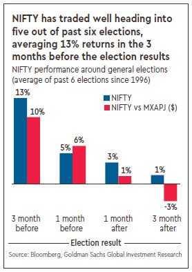 NIFTY has rallied in five out of the past six general elections since 1996 with average 13/5% returns in 3-mo/1-mo before the election results. Cyclicals like banks, industrials, materials and autos have led. Stylistically, investors have rotated out of ‘quality’ stocks (strong balance sheets, stable growth) into value and mid-caps.
