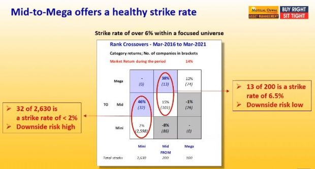 Raamdeo Agrawal shared a Motilal Oswal study of 2,930 companies during March 2016-March 2021, comprising 100 mega stocks, 200 mid caps, and 2,630 mini shares. Out of 2,630 mini companies, 32 companies crossed to mega, giving a return of 45 per cent. But the strike rate was low at just 2 per cent, translating into high downside risk. During the same period, 13 of the 200 mid cap companies crossed to mega, giving 38 per cent return at a strike rate of 6.5 per cent, implying a low downside risk. Raamdeo Agrawal advised investors to focus on mid-sized companies, instead of very small companies, as it could provide a strike rate of 6-7 per cent with higher probability of success.