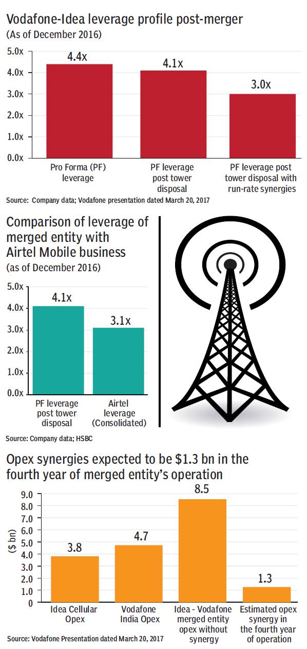 Synergies are more medium term: Merged entity expects to achieve synergies with an NPV of $10.5 bn and estimated $2.1 bn of savings in the fourth year of completion, which suggests limited upside in the near term. The consolidated entity plans to continue with a multi-brand strategy, removing an obvious area for savings around marketing costs. Similarly, savings in terms of employee costs are expected to be limited. Hence, opex synergies will need to come from network and IT only. At the same time there is an attempt to monetise Indus and, hence, network savings may need to come from other tower companies and this may imply gradual savings on network costs until Indus is monetised.