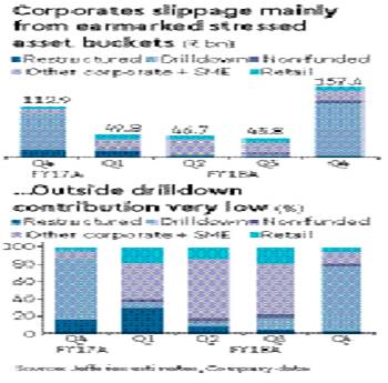 The total net stressed assets declined further to 7.3% versus 9.1% of net advances sequentially. The provision coverage excluding technically written-off accounts remained stable at 48.4% versus 48.3% sequentially. Rs 157.37 bn was the fresh addition to gross NPAs in Q4FY18, implying a slippage ratio (as a percentage of 12m prior loans) of 12.09%. However, 75% of these slippages came from already earmarked stressed assets watch list. No explicit guidance on slippage or credit cost has been provided, but management is confident of lower slippages in FY19 vs. FY18. Beyond these, additional lumpy slippage was from three identified accounts in gems & jewellery sector with o/s close to Rs 7.9 bn. For this, company made Rs 2.9 bn of provisions through P&L account whereas Rs 5.1 bn was directly debited through reserves & surplus.