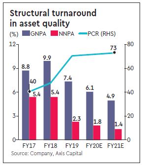 Changes in risk management framework over the course of last three years (self-imposed concentration limits, higher mix of better-rated corporates) will likely result in lower credit cost. While near-term credit costs stay elevated due to ageing of NPAs, we expect credit cost to moderate to ~150 bps (from current level of ~250 bps) by FY21.