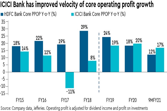 Improved velocity of operating profit growth and stable asset quality to make earnings less volatile: ICICI Bank has improved the velocity (pace and direction) of operating profit over the past two years, reflecting improved topline and cost efficiencies. In fact, ICICI’s performance has now become comparable with HDFC Bank’s (industry best) and as comfort on asset quality/ credit-cost improves, this should translate into stable growth in net profits as well.
