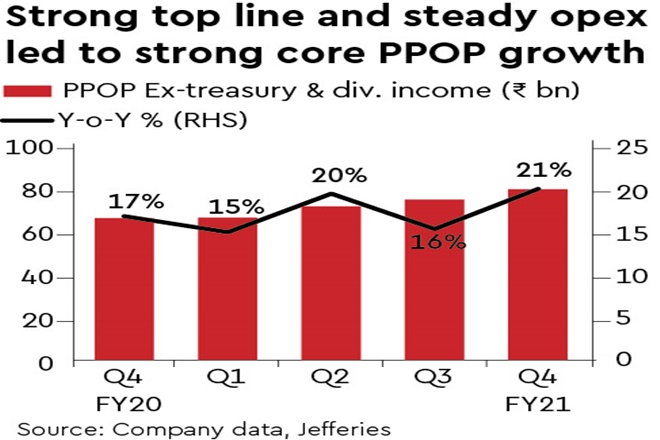 Slippages manageable; contingent provisions lifted: Slippages for Q4 (adj. for proforma slippages of past) were in line with expectations and annualised at 3.4% of past year loans. Retail delinquency ratio has increased over the past year, reflecting the impact of Covid and growth in non-mortgage loans. Overdue loans (that are not NPLs) are getting closer to pre-Covid levels. BB rated book is at 2.4% and ECLGS loans at 1.9% that cover ~12% of loans. The bank made additional contingent provisions of Rs 10 bn and buffer provisions have risen to 1.2% of loans.