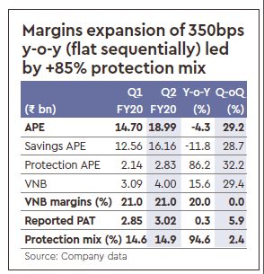 Protection business momentum remains strong driving VNB growth: While the savings business fell 8% y-o-y in 1HFY20, protection APE was up 85% in Q2FY20/1HFY20. Share of protection APE in total APE increased to ~15% from 9% in FY19. This has led to VNB margins increasing to 21% in 1HFY20 from 17.0% in FY19. VNB grew by 20% in 1HFY20. We factor in 20% CAGR in VNB over FY19-21F.