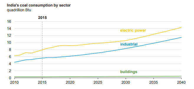 In the projection period of 2015-to-2040, India’s coal consumption will rise due to sustained industrial growth, especially iron and steel industry. Further, increased efforts to electrify the country’s rural areas are expected to drive the increase in coal consumption. The use of coal in the industrial application will alone increase from 6 quadrillion Btu to 11 quadrillion Btu by 2040, the EIA report said.
