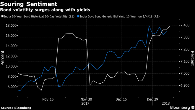 India’s sovereign bond market is seeing its wildest swings in a year. Volatility in the 10-year debt has doubled in the past six trading sessions, with investors caught between the attraction of Asia’s second-highest yields and the fear spurred by accelerating inflation and an expanding supply of bonds. The yield on the benchmark traded with a 10 basis-point swing on Wednesday before closing at 7.32 percent.