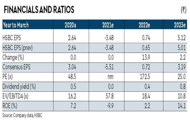 Forecasts and valuation adjusted: We have adjusted our forecasts slightly, mainly increasing occupancy levels slightly. However, with improving trading, we value the consolidated business using the sector average EV/Ebitda for FY22e, which is 22.0x, up from our previously used down-cycle average EV/Ebitda of 18.5x. This increases our TP from Rs 120.50 to Rs 151.0. We maintain our Buy rating.