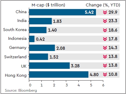 With Thursday’s fall, the Indian stock market has lost about $557 billion in value since the beginning of the year. This fall is second only to the contraction in the Chinese market during this period. China lost $2.3 trillion of market value during the same period, although since its peak in June 2015, its market capitalisation had eroded 46% to $5.42 trillion.