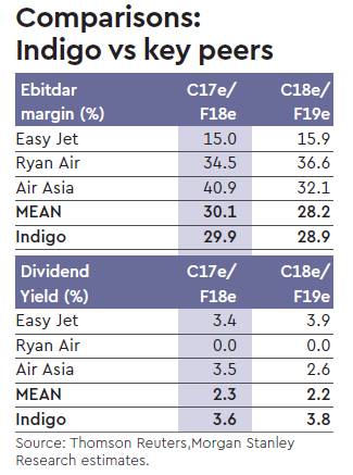 Indigo is slowly moving toward owning planes via internal accruals. Dividends take a hit but NPV of owning is higher than renting, thus we don’t view this move as a negative. Stay EW as valuations seem fair to us. Owning vs. leasing — on NPV basis, owning wins: While dividends going down is a short term hit, in looking at NPV (net present value) of both methods, we believe that for established airlines with good credit ratings, owning can make more sense than leasing. Indigo is looking to own planes but via internal accruals: The company is looking to buy planes mainly via internal accruals and not raise debt. The pace of fleet owned will gradually rise, assuming that company buys 6, 6 and 8 planes in FY18, FY19 and FY20, respectively, (referred to as Scenario A); then operating leases as a percentage will go down from 87% in FY17 to 84% in FY20. Indigo’s lease rentals are 17% of FY17 actual sales while depreciation was lower at around 2-3% of sales as cost of six year leases that the company takes are high. Overall while dividend yield drops, but assuming scenario A, we see 2% to 4% jump in FY18/19 earnings.