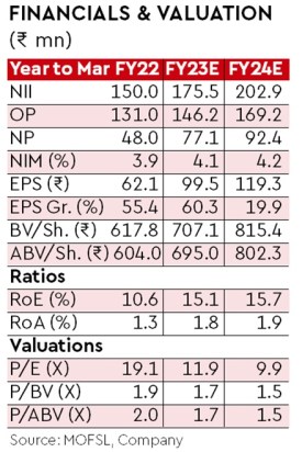 With key issues addressed, and steady progression in earnings along with improving growth momentum we expect the stock to re-rate further. We estimate FY24 RoA/RoE of 1.9%/15.7% .