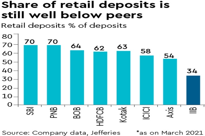 IIB’s FY21 annual report underlines progress on improving funding-mix – share of retail deposits, ALM, etc. Premium of rates to large-banks is falling & there is scope for more that can help derisk loans. Asset growth slowed & RWA/asset fell back to 75%. Our recent conversation with mgmt indicates plan to build provs. for exposure to Vodafone-Idea (VIL) in FY22 that drives 20%+ cut to EPS est. Still FY23-24 estimates hold up as credit costs normalise towards 1.8%. Buy stays.