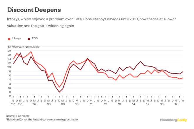 It’s the transparency that made Infosys the first Indian tech company to trade on Nasdaq in 1999. (It’s now changed the listing to New York). Some of the other co-founders’ insistence on having a go at running Infosys before retirement saw the shares’ premium over TCS turn into a discount. Early enthusiasm over Sikka, a former tech czar at SAP SE, closed that gap. Amid a recent spate of departures of senior talent, however, the discount is widening again.