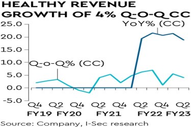 Signs of cautious behaviour amongst clients are visible in terms of delay in decision making in select verticals. Management pointed to emerging weakness in telecom and Hi-tech verticals especially in discretionary spends apart from retail and mortgage subsegment in BFSI called out in previous quarter. Despite macro headwinds leading to weakness in certain pockets, Infy won an impressive broad-based large deal TCV (total contract value) of $2.744bn, up 27.5% y-o-y, highest in last seven quarters. TCV comprises healthy 54% net new deals. Management alluded to increased traction in cost efficiency and automation deals. This is also reflected in an uptick in core services revenue in Q2FY23. Higher scrutiny on spends is resulting in renewed focus on cost takeouts. Management revised the lower end of revenue guidance band upwards to 15-16% y-o-y CC vs 14-16% earlier driven by strong performance in H1FY23 and strong bookings. Guidance factors in slowing demand in certain verticals and seasonal weakness historically experienced by Infy in H2 mainly due to furloughs and lower working days.