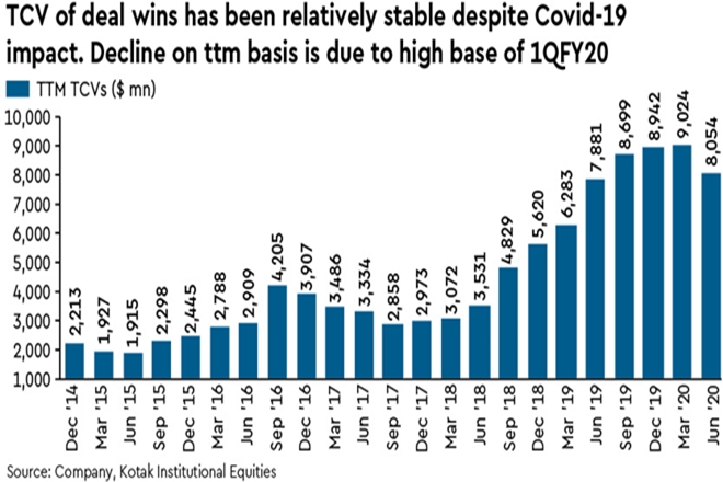 Infosys also reported stability across verticals and growth in some like communications, life sciences and hi-tech; exceptions to the trend were manufacturing (-8.2% q-o-q) and retail (-9.9% q-o-q). We attribute the outperformance to—(i) lo-wer supply side impact at just 0.2% of revenues; (ii) ramp-up of strong net new deals won in Q4FY20; (iii) its portfolio of banking clients may not have cut spending; (iv) better execution and market share gains; and (v) exposure to high growth, hi-tech vertical accounts.
