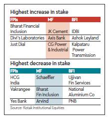 During the quarter, FPIs and DIIs increased their weightage particularly in private banks, information technology (IT) and fast moving consumer goods (FMCG). They decreased weightage in autos, PSBs, and telecom. FPIs raised their stake in IT and FMCG, but cut in autos. DIIs increased their stake in private banks, but reduced stake in autos and NBFCs. FPIs are overweight on autos, NBFCs, cement, pharma and under weight on banks, engineering, metals and oil.