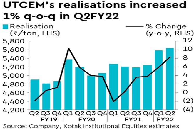 The management maintained its guidance for completion of its 19.5-mtpa grinding and 11.1-mtpa clinker capacity expansions by FY2023-end. UTCEM’s India capacity would increase to 131 mtpa by FY2023e (capex of $46/ton) or at a two-year CAGR of 5.5%, ahead of industry capacity growing at 4.4% CAGR. Further, WHRS capacity would increase from current 137 MW (+12 MW in Q2FY22) to 300 MW by FY2023e-end, increasing the share of green power to 34% by FY2024e from 15% in Q2FY22. This shall result in annual power costs saving of Rs 6 bn.