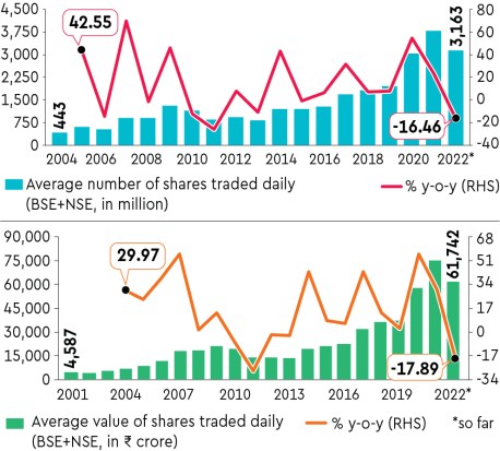 According to data by Bloomberg, the average combined (BSE and NSE) traded volume so far this year has been 3,163 units per million, down 16.46% from 2021, while the average combined turnover has been Rs 61,742 crore, down 17.89%.